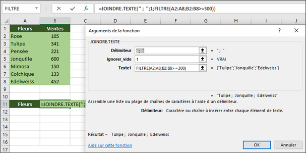 La fonction FILTRE insérée dans la zone de sélection du texte permet de filtrer une plage avant de joindre ses valeurs