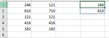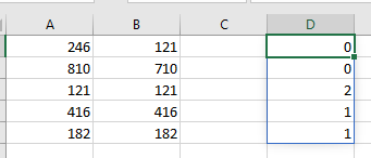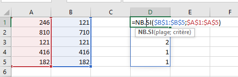 Dans le résultat obtenu, on constate par exemple que le nombre 121 présent 2 fois et que 810 et 246 ne sont pas présents dans la colonne B.