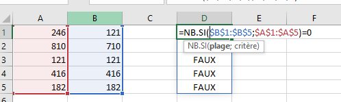 Pour rechercher le contenu des cellules de la colonne A qui n'existe pas dans la colonne B, écrire la fonction NB.SI selon la syntaxe suivante : =NB.SI($B$1:$B$5;$A$1:$A$5)