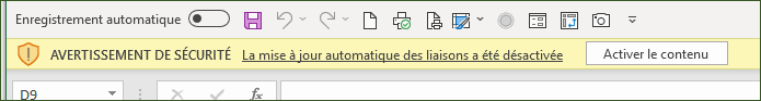 Un message affiche que la mise à jour des liaisons a été désactivée