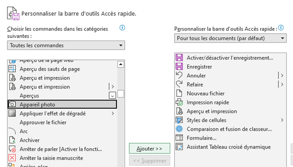 L’outil Appareil photo n’est pas affiché dans le Ruban, pour y accéder, on peut