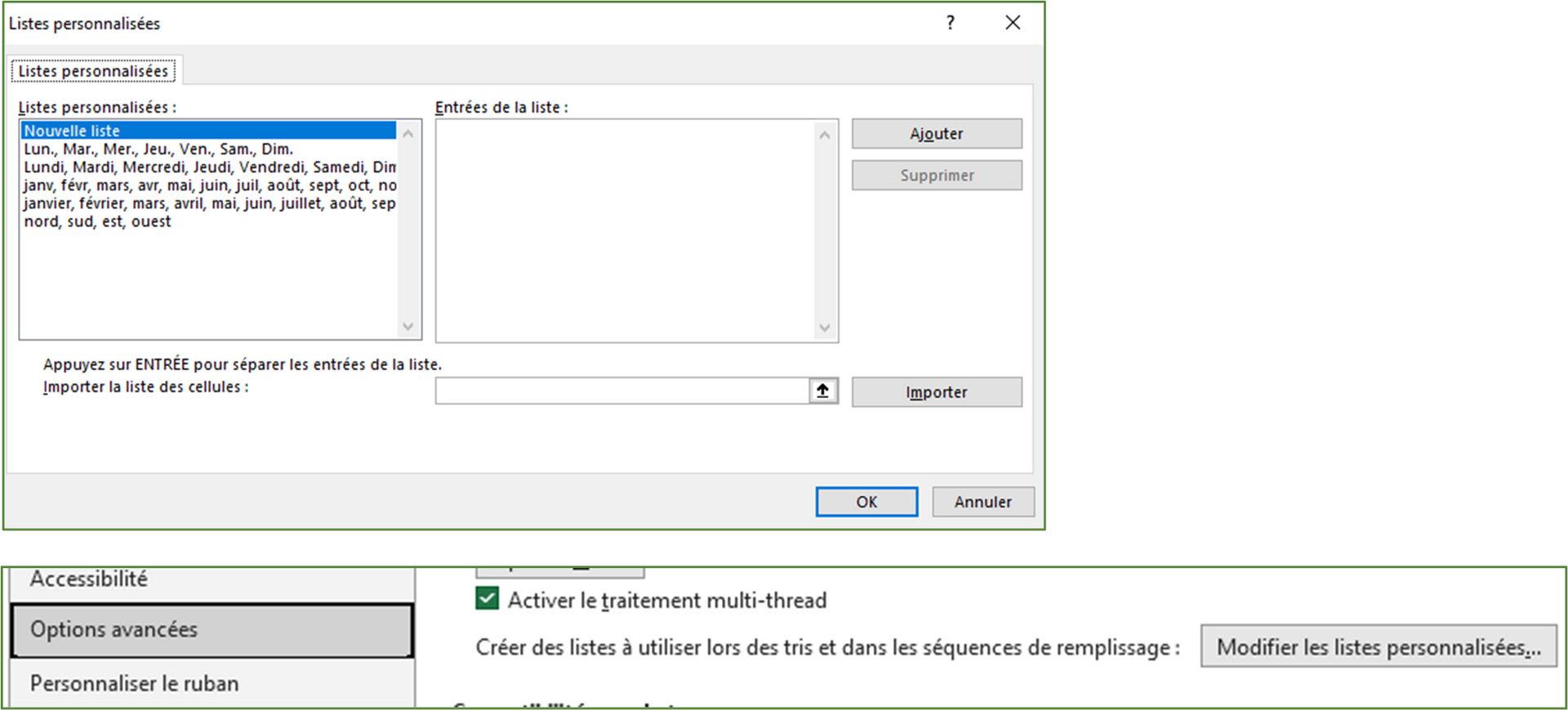 - Accéder à la boîte de dialogue Listes personnalisées
