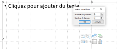 - Cliquer sur le bouton Insérer un tableau symbolisé par un petit tableau dans l’Espace réservé de la diapositive