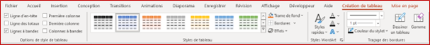 - Les options de l'onglet Création de tableau permettent de choisir la mise en forme et les styles