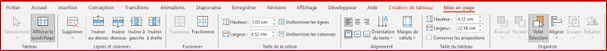 - Les options de l'onglet Outils du tableau – Mise en page permettent de gérer la Taille, l'Alignement et la Fusion des cellules ainsi que l'Organisation des objets sur la diapositive