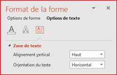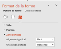 - Utiliser de la même manière les outils d'alignement vertical du groupe Alignement ou le Volet Format de la forme