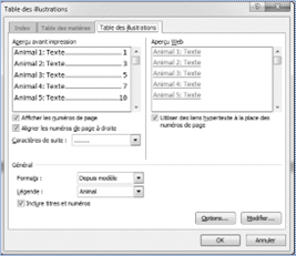 - Cliquer sur le bouton Options de la boîte de dialogue Table des illustrations